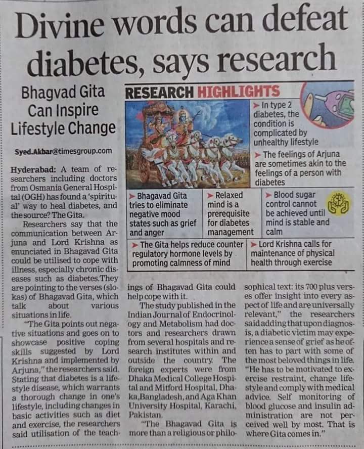 భగవద్గీత లోని దేవుని పలుకులు మధుమేహం(షుగర్) ను జయించగలవు, ఎలాగ అంటే, మానసిక ఉత్తేజం తో అని పరిశోధన చెపుతుంది. గీత మన జీవిత విధానం, మారడానికి స్పూర్తిని ఇస్తుంది. ఎటువంటి నిరాశకు గురి కాకుండా, తగిన వ్యాయామము ఆహార నియమాలతో సుఖ సంతోషముతో జీవించ గలిగితే, అంత ఇబ్బంది ఉండదు.