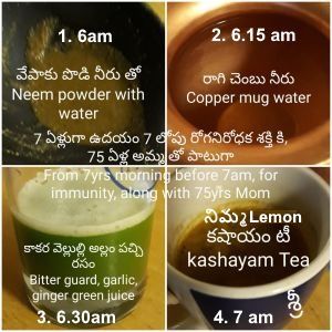 | 6.15 AM | టీ = నిమ్మ తేనే తో కలపండి , ఇవి మరిగాక లవంగా + మిరియాల పొడి + అల్లం ముక్క + పసుపు + యాలక + ఎండు ద్రాక్ష + నీళ్ళు గమనిక 13 మరియు చిత్రాన్ని కూడా చూడండి [ tea = Add lemon + honey after boiling clove + pepper powder + ginger + turmeric + Cardamom + water + Raisin]. See Note 13 and image also |