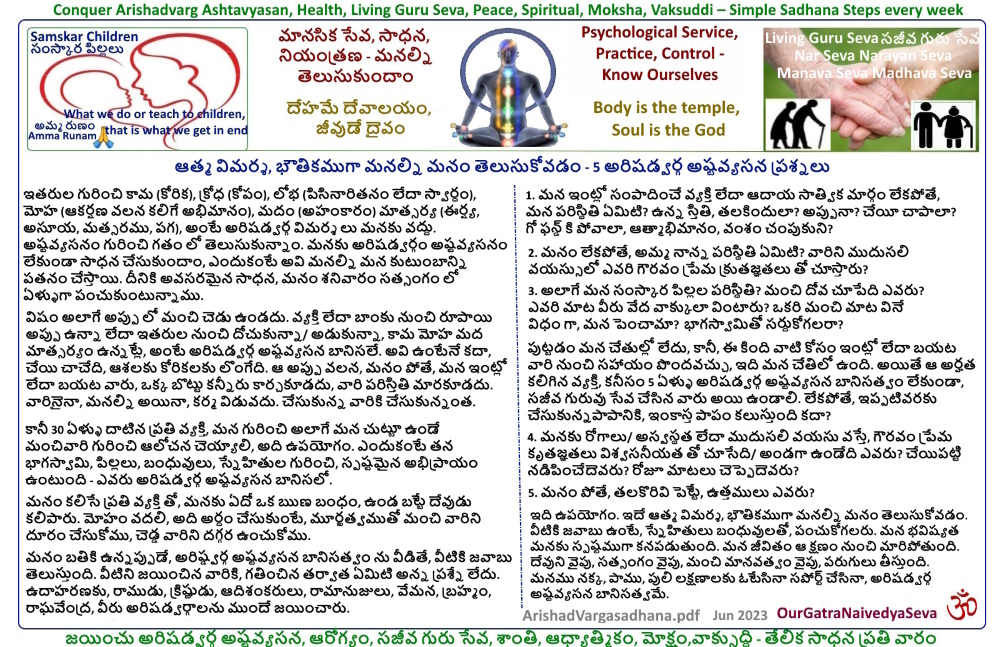 ఆత్మ విమర్శ, భౌతికముగా మనల్ని మనం తెలుసుకోవడం - 5 అరిషడ్వర్గ అష్టవ్యసన ప్రశ్నలు