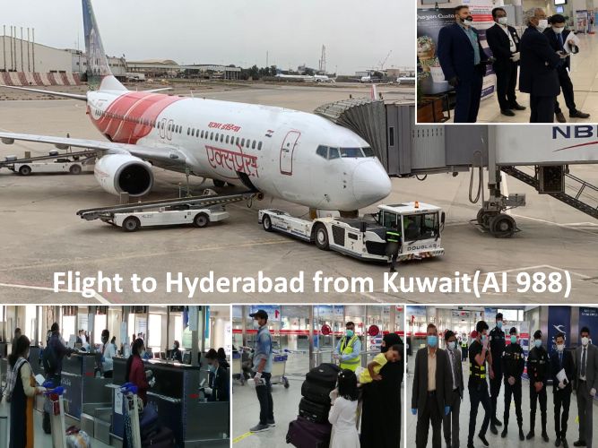 3. కువైట్ (ఎఐ 988) నుండి హైదరాబాద్కు ప్రత్యేక తరలింపు విమానం, ఈ రోజు 160 మంది ప్రయాణికులతో బయలుదేరింది. రెండు విమానాలు, బాధపడుతున్న ఒంటరిగా ఉన్న, భారతీయులతో నిండి ఉన్నాయి. ఆపరేషన్ పర్యవేక్షించే టీం ఎంబసీ కువైట్ రాయబారి.